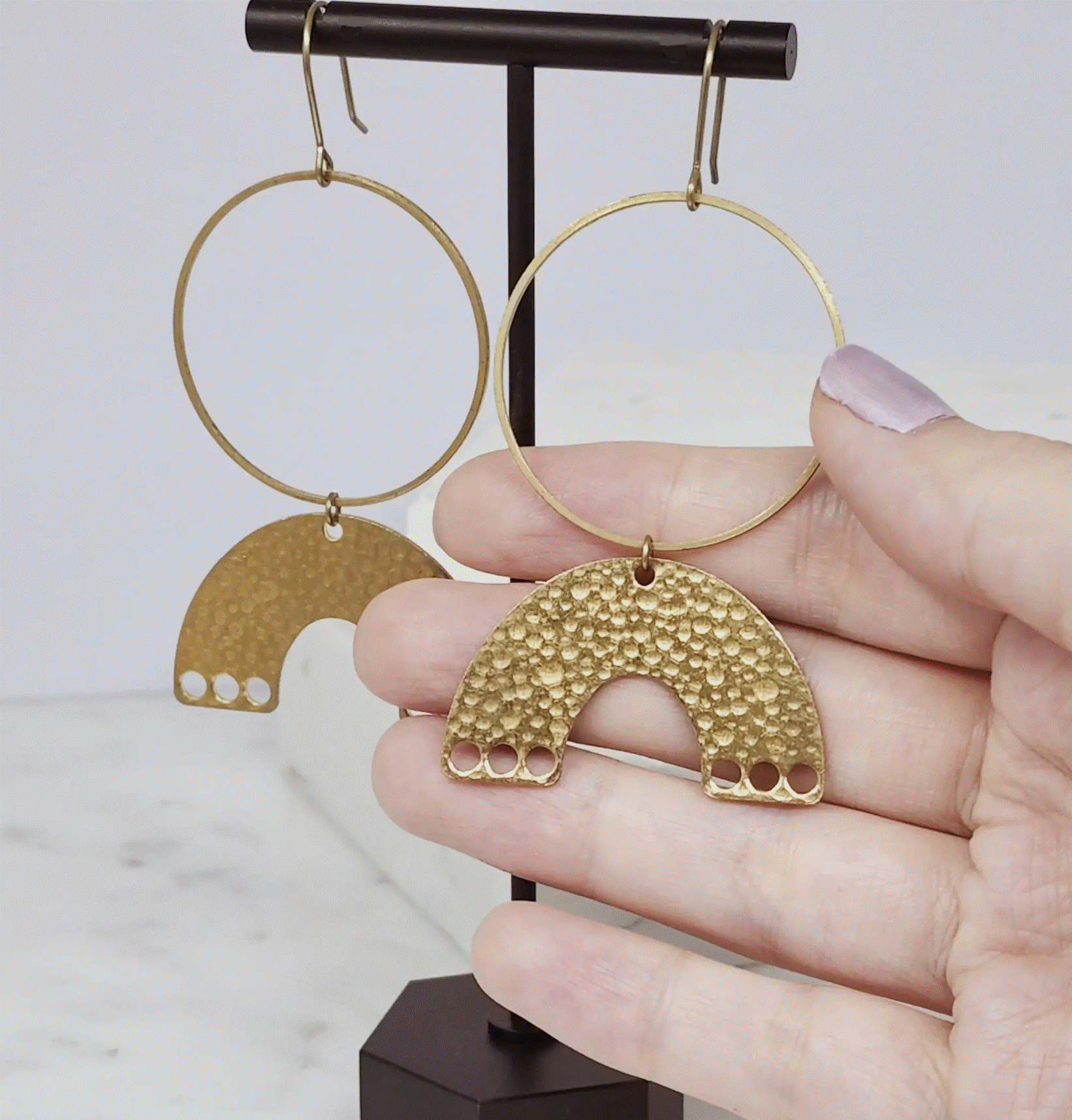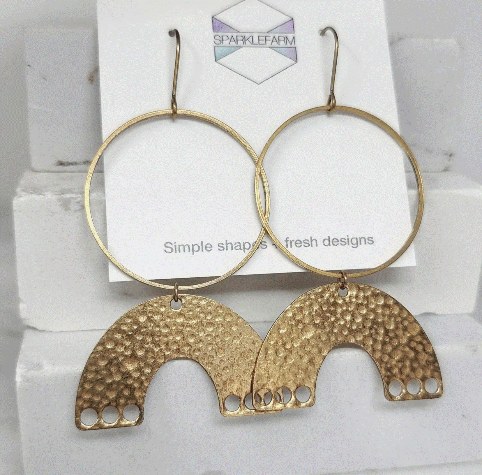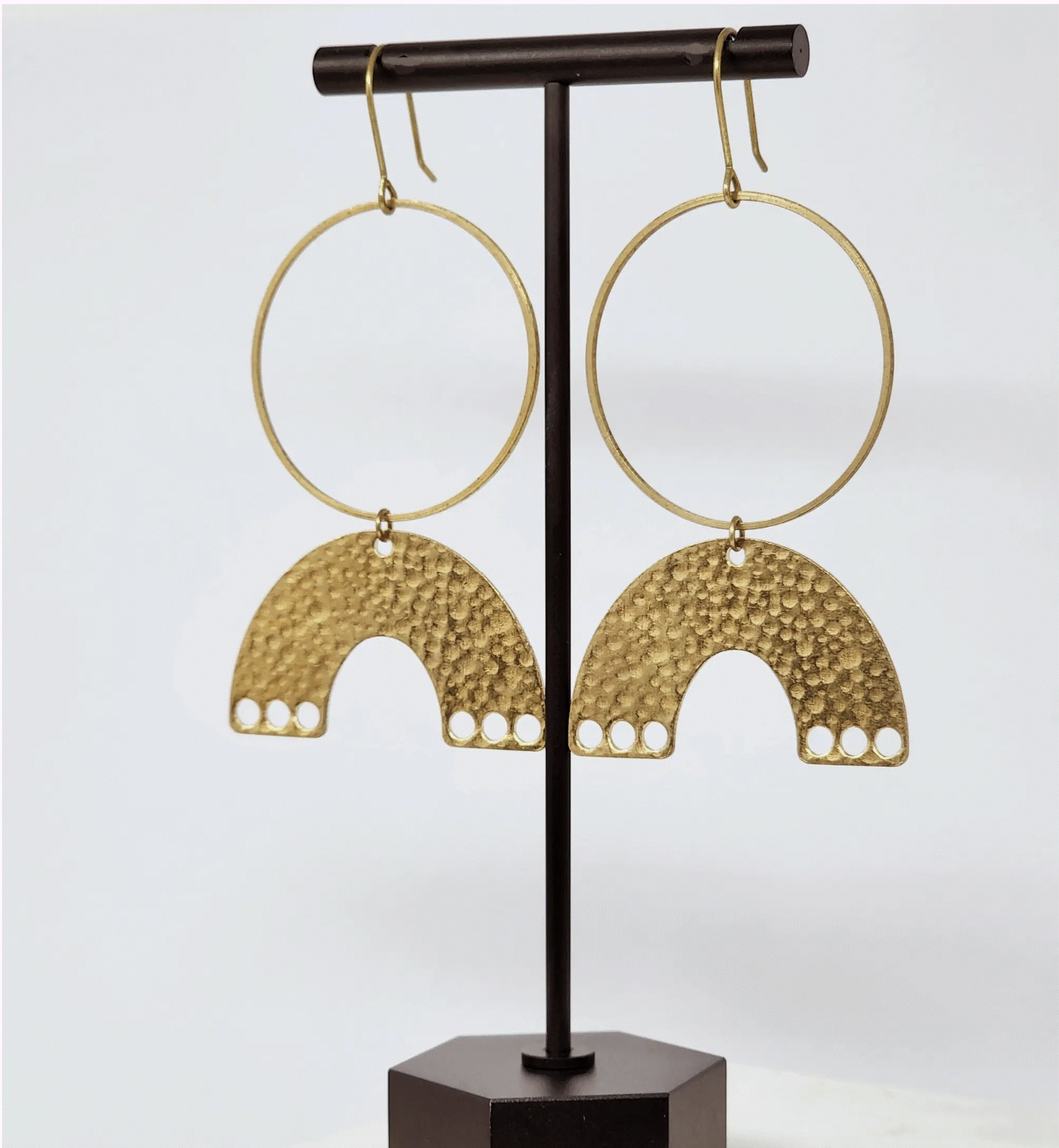 Bold and bright boho-chic dangles. They combine large brass circles with hammered brass arcs swinging below.