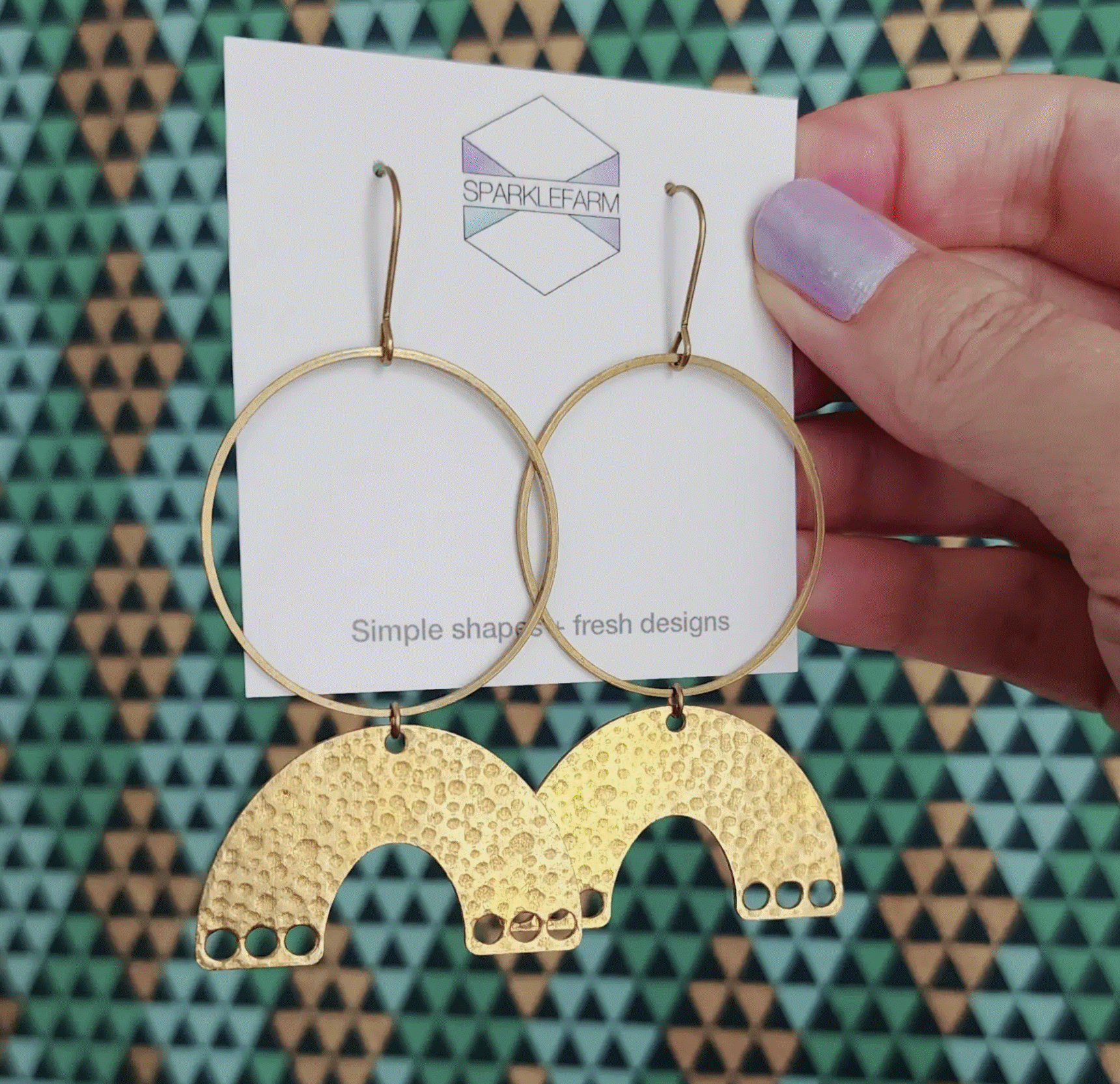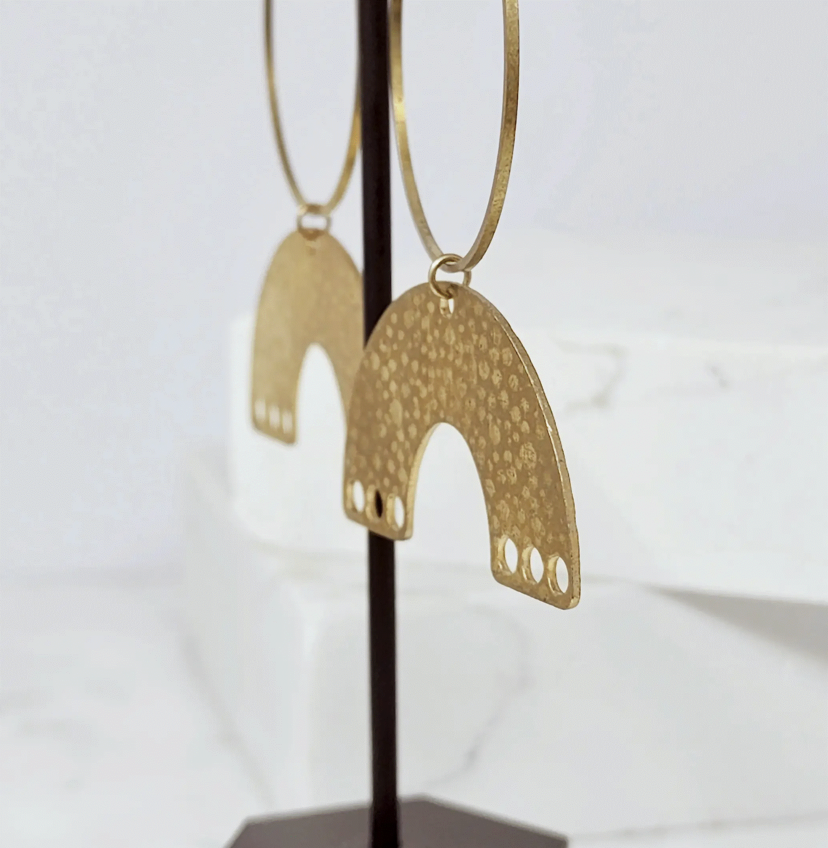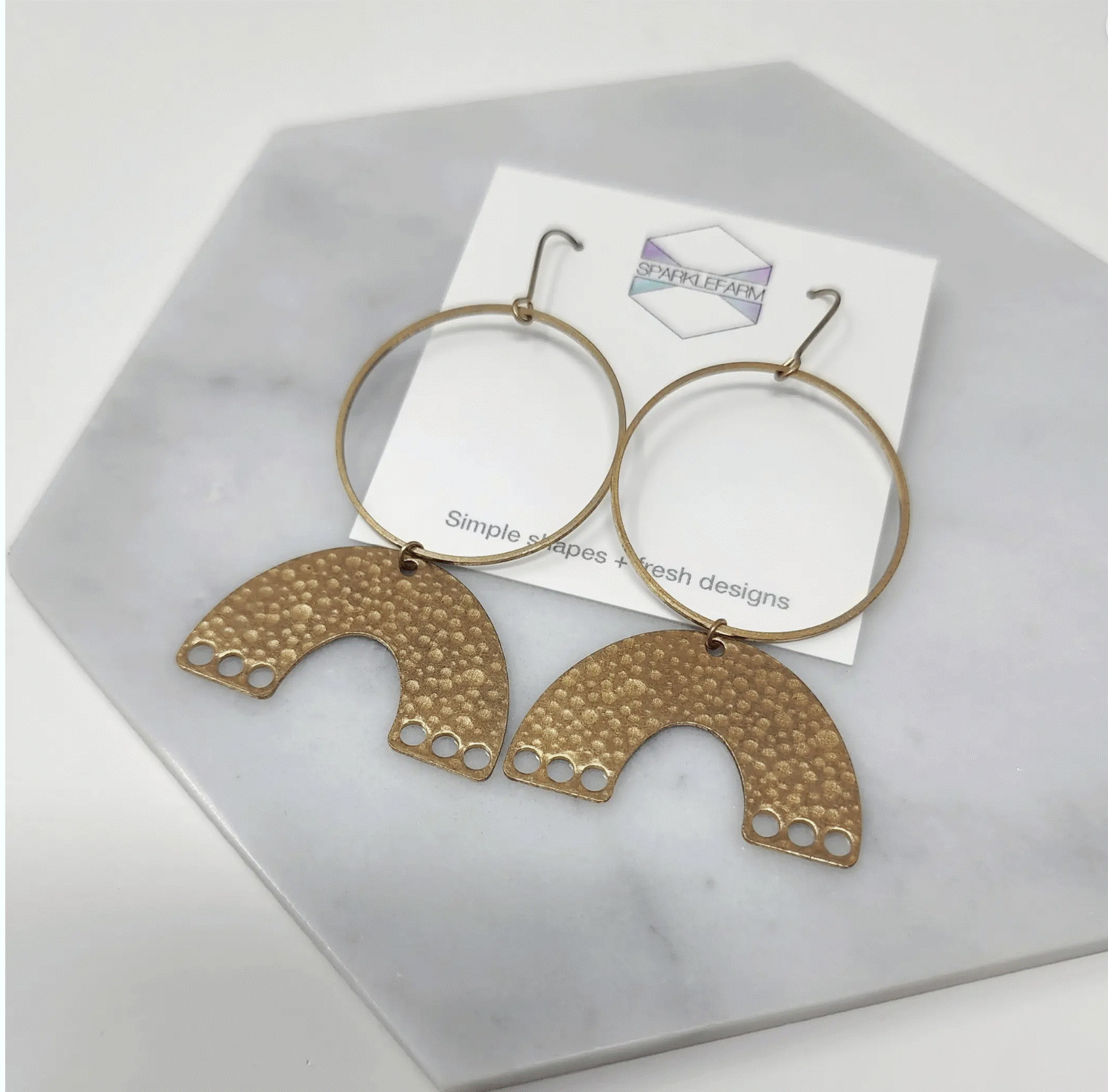 Bold and bright boho-chic dangles. They combine large brass circles with hammered brass arcs swinging below.