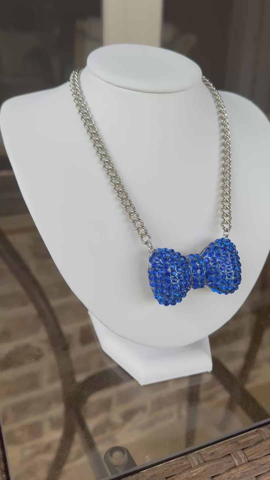 Introducing our stunning Chunky Blue Bow Necklace, complete with a sparkling royal blue rhinestone accent on a silver metal chain. With its large and eye-catching bow pendant, this necklace is the perfect addition to any accessory collection. Make a statement in your style with this must-have necklace.
