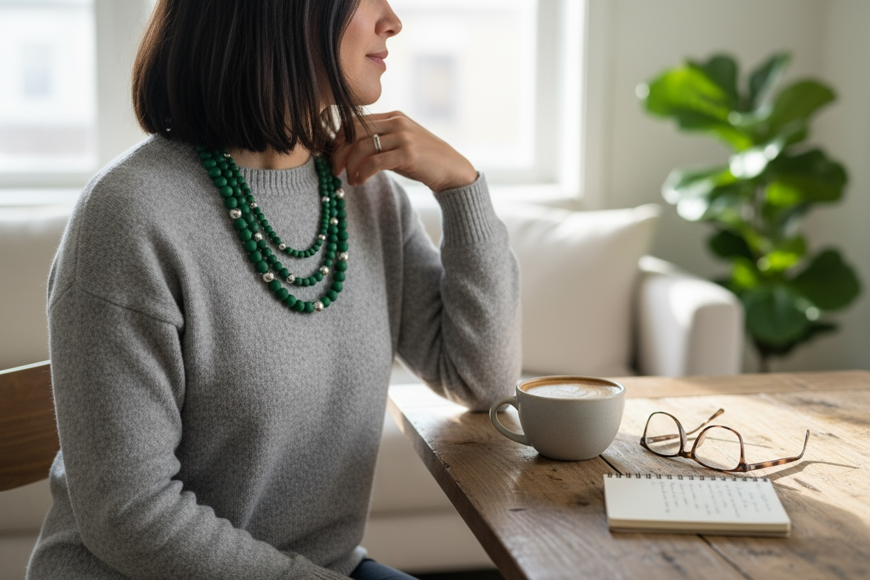 This eye-catching triple-strand layered necklace features matte green and polished gold-tone beads. The round beads vary slightly in size across the strands. Whether you're seeking a pop of color for neutral outfits or a complementary accent to your existing wardrobe, this statement piece delivers versatility with undeniable presence.