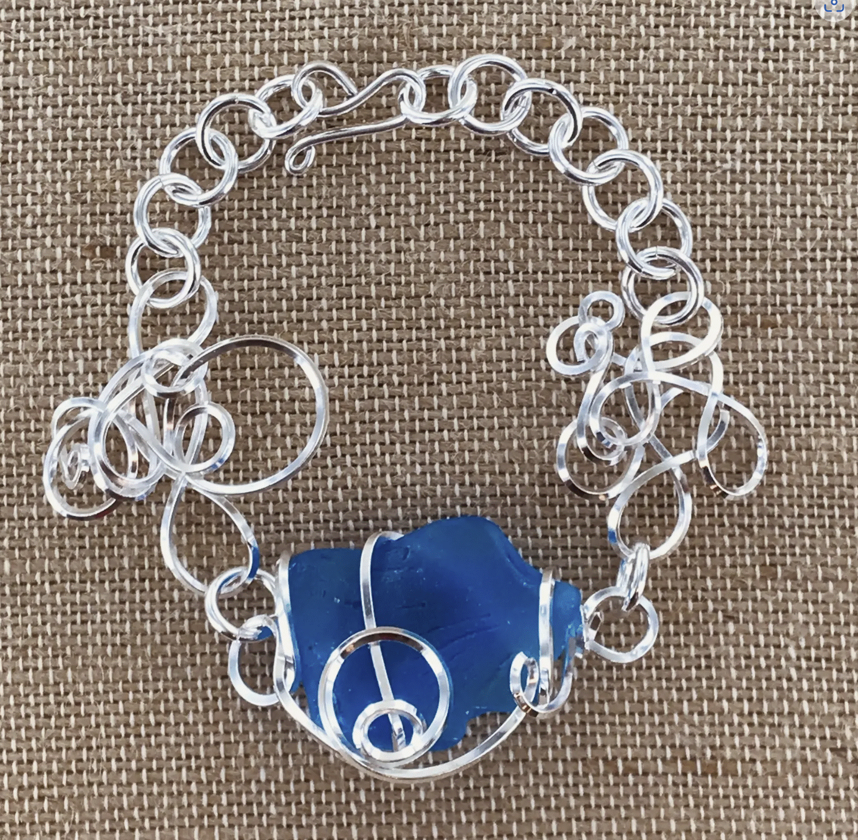 This bracelet features a piece of cultured sea glass hand wrapped in a wire with abstract scribble designs to each side. The bracelet measures on average 8 inches at its longest and 6 inches at its shortest with an adjustable hook closure, although length will vary some depending on the size of the glass. Due to being recycled/re-purposed glass the sizes, shapes and depth of color will vary.