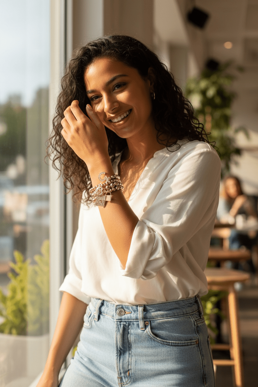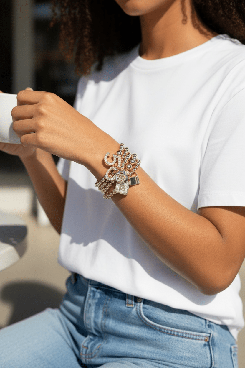 Layer on luxury with this stunning gold beaded charm stack that captures high-fashion elegance. Each piece tells a story, from the sparkling crystal-adorned initial to the delicate perfume bottle, romantic heart, and secure lock charm. Mix and match these five distinctive elements to express your personal style and create a look that's entirely your own. Perfect for stacking or gifting. Heighten any jewelry collection with designer-inspired sophistication.