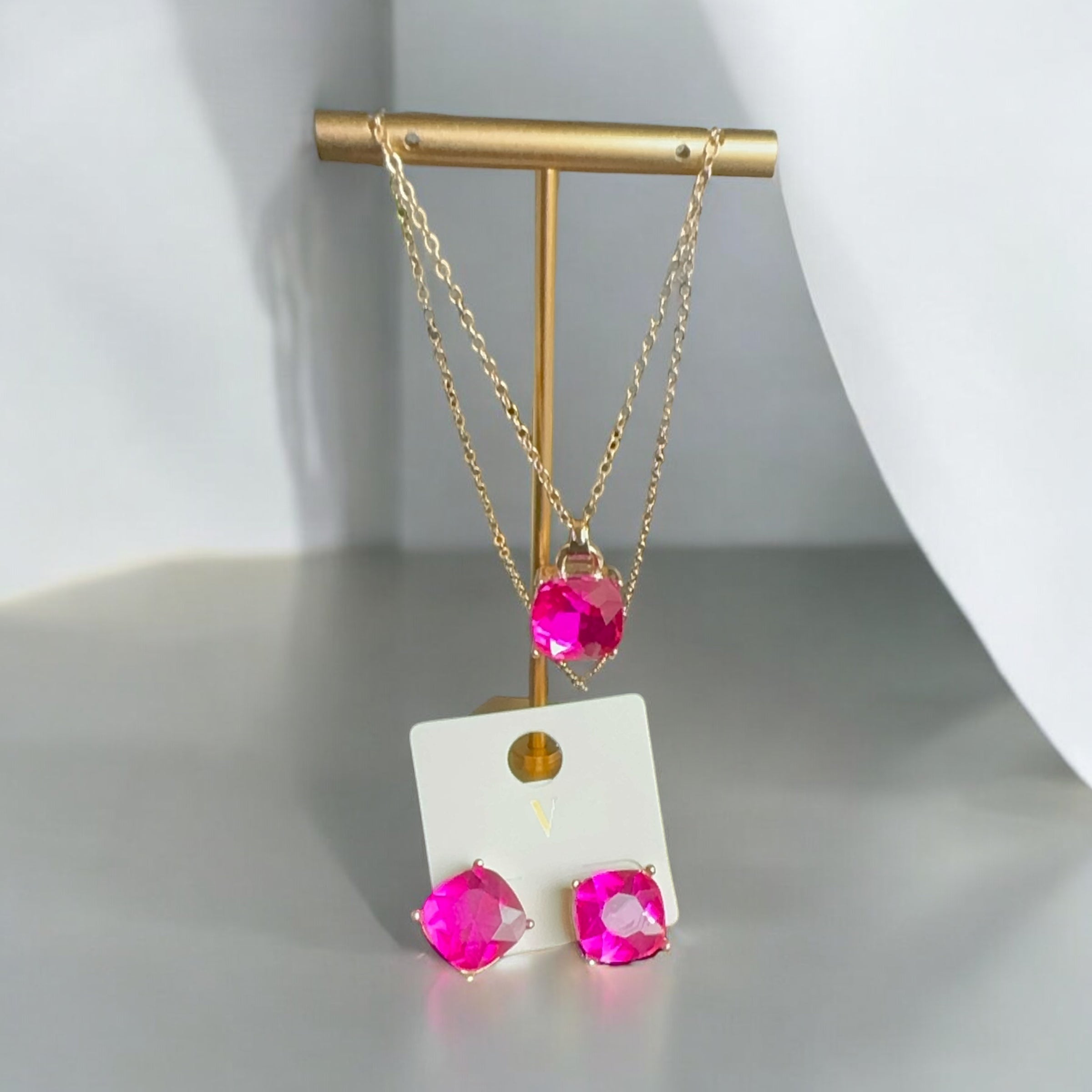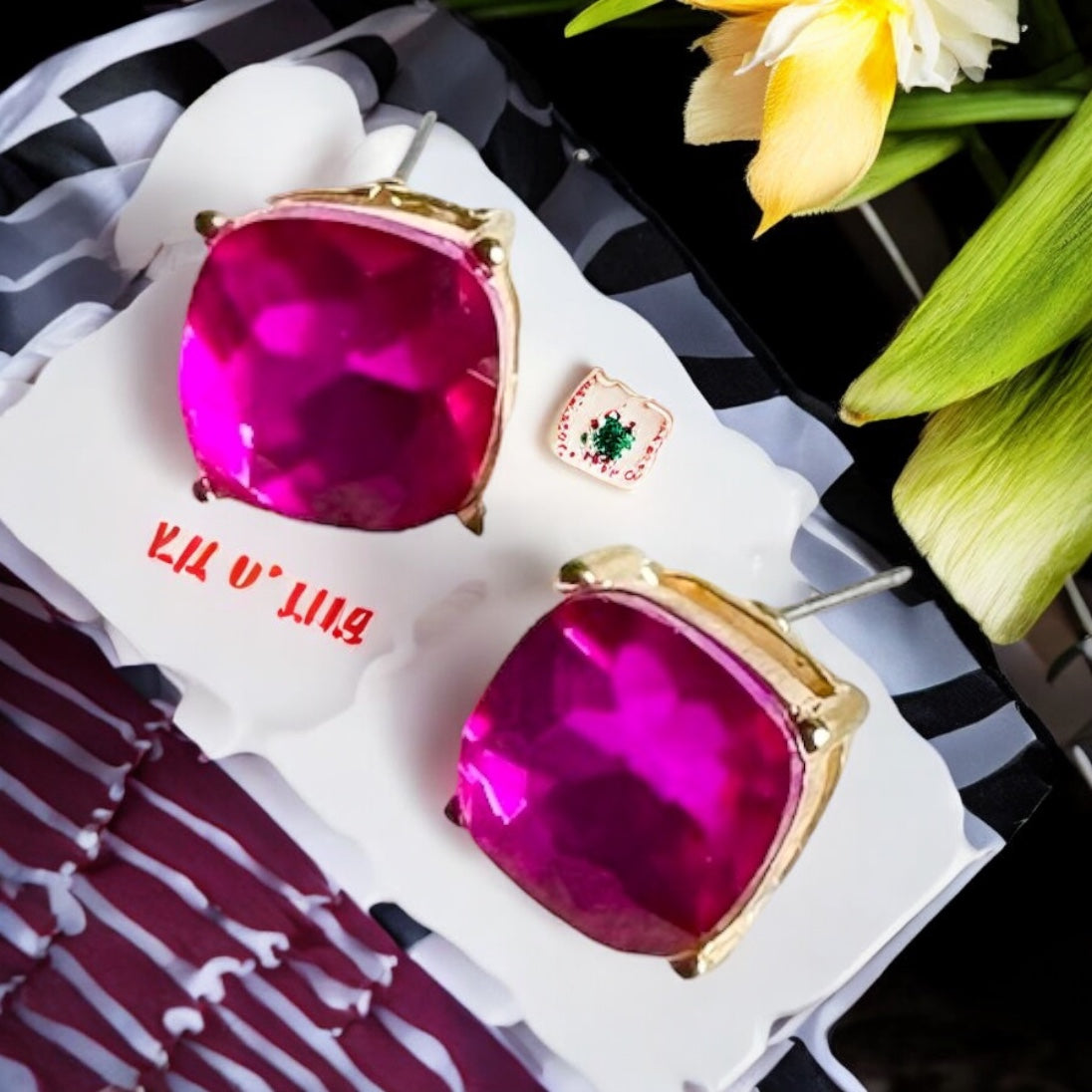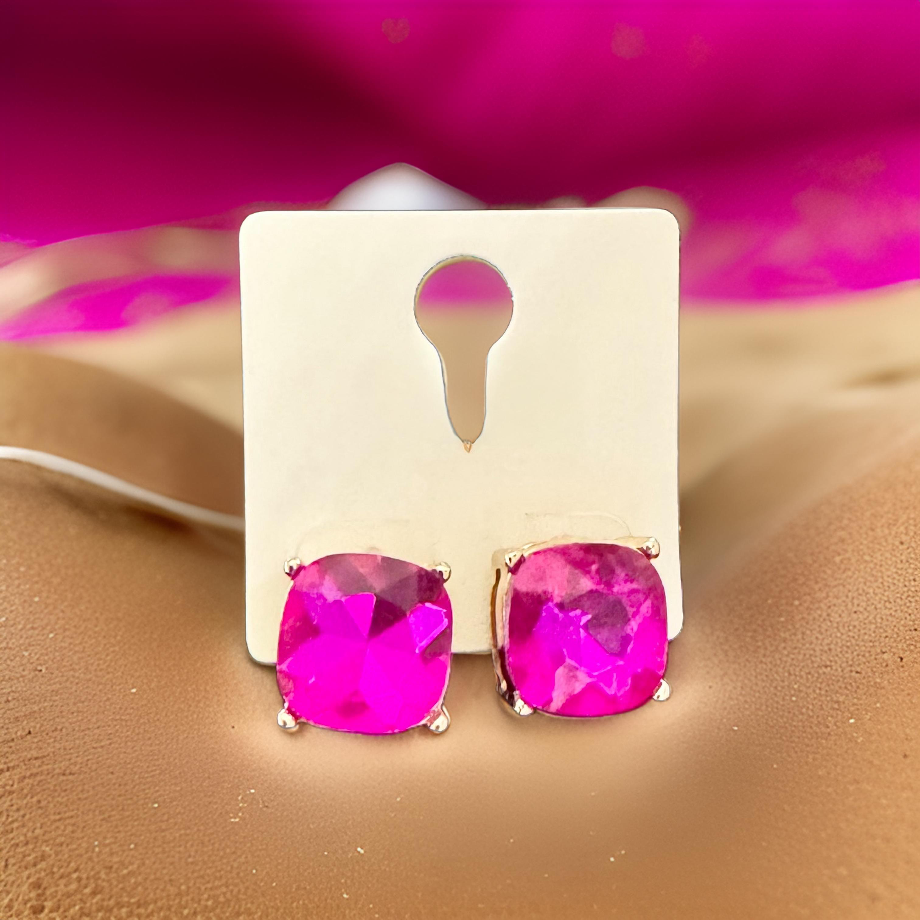 Enhance your wardrobe with this elegant and timeless gold-tone and fuchsia square earrings, a must-have for any occasion.