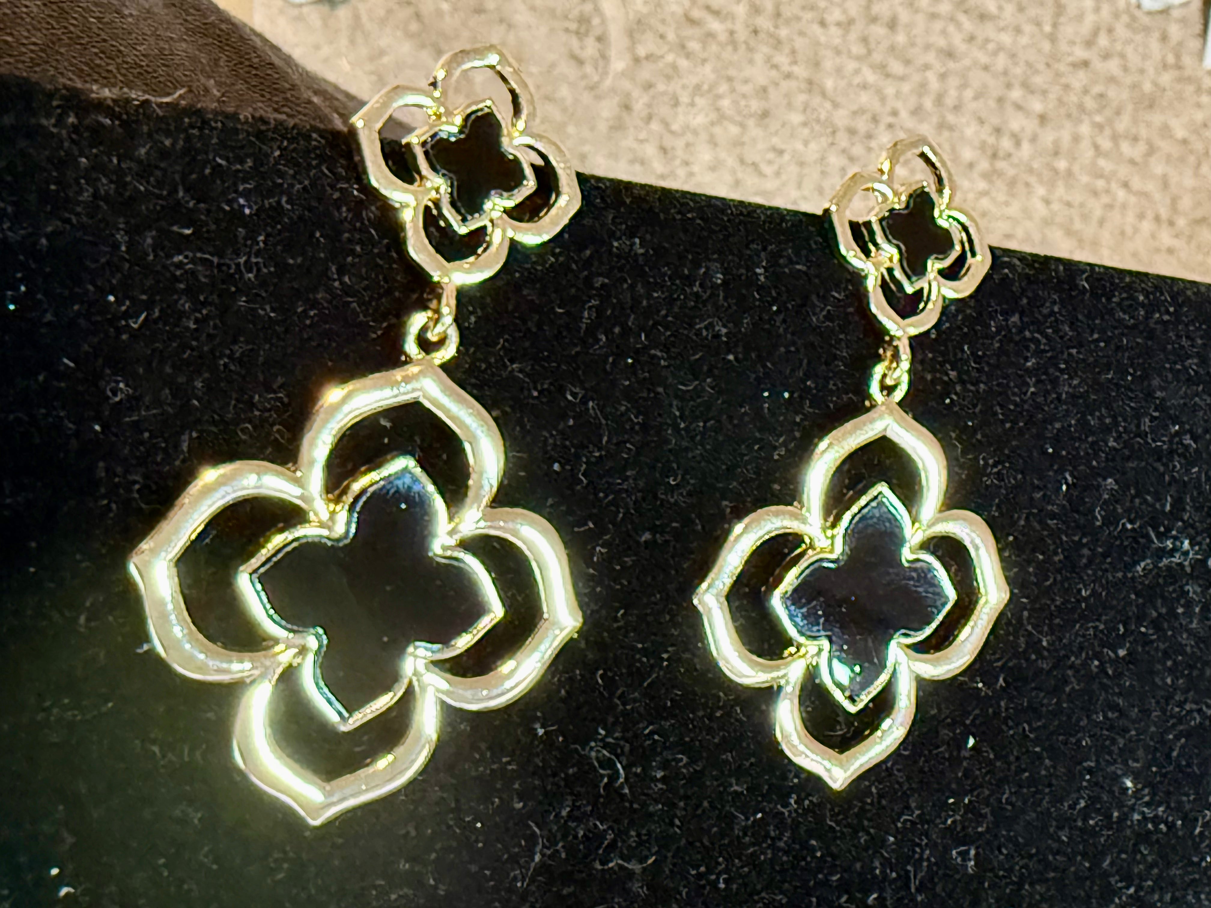 Make a graceful statement with these enchanting black clover dangle earrings, featuring a luminous gold tone polish that radiates timeless elegance. The double clover design sways delicately with your movements, infusing your style with both charm and symbolic meaning. These versatile earrings are the perfect choice for anyone seeking jewelry that blends beauty with purpose, whether as a gift or a personal treasure.