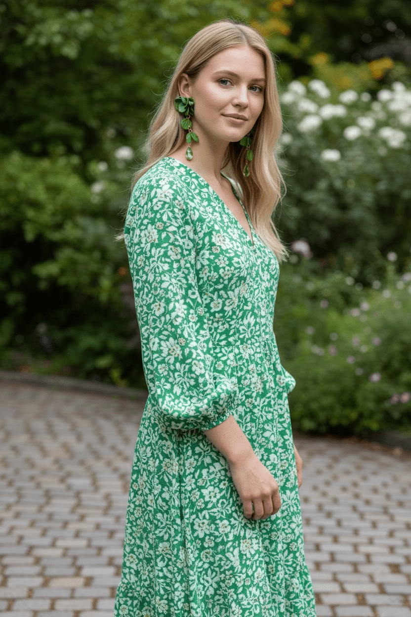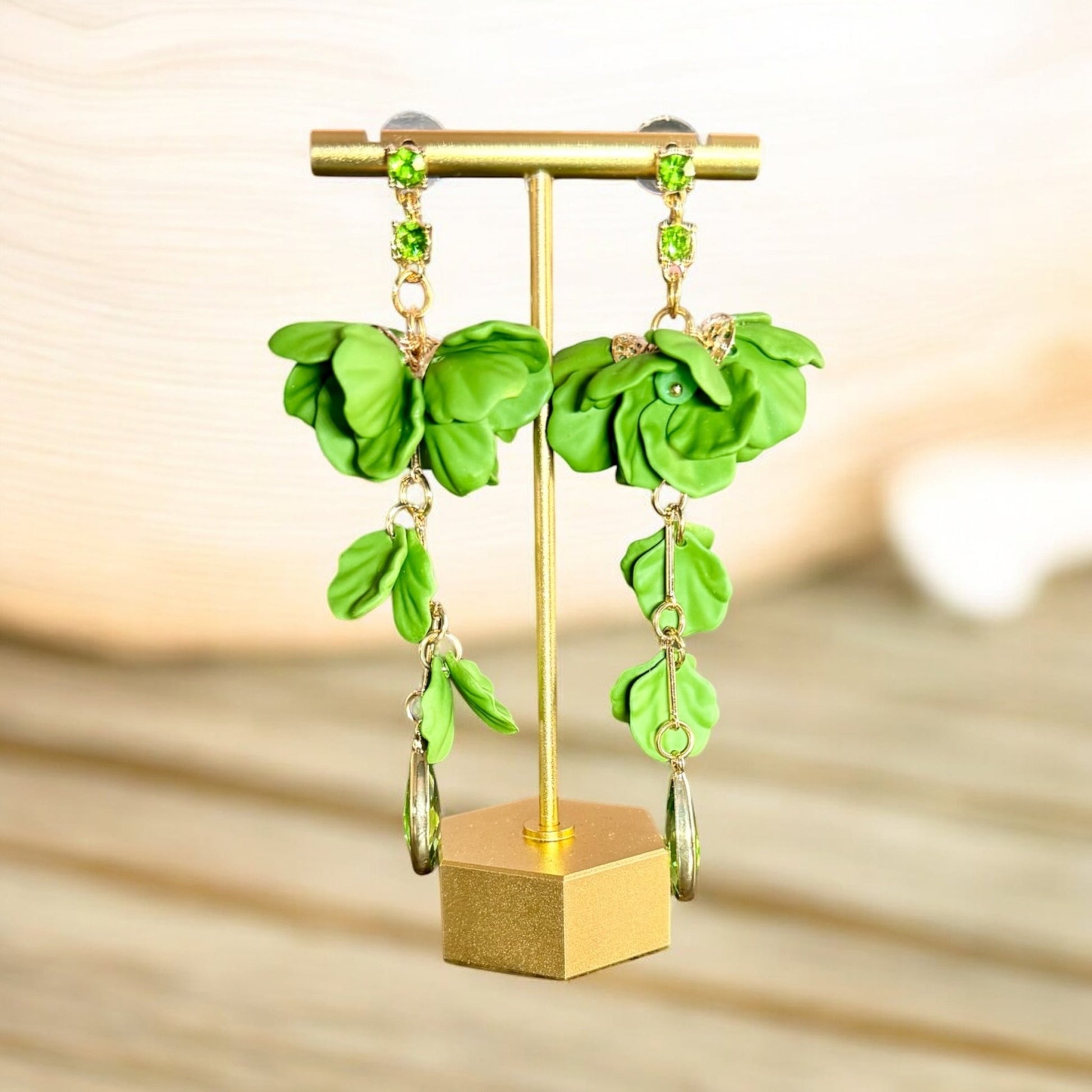 Discover the perfect blend of floral-inspired design and radiant sparkle with these exquisite drop earrings. Featuring lush green florals paired with gleaming crystals, they're crafted to turn heads and complement any complexion. These versatile beauties transition seamlessly from casual outings to formal affairs, making them an essential addition to your jewelry collection that you'll reach for again and again.