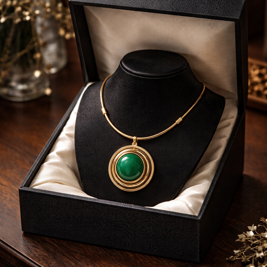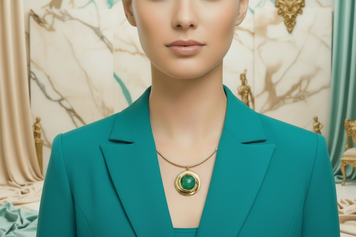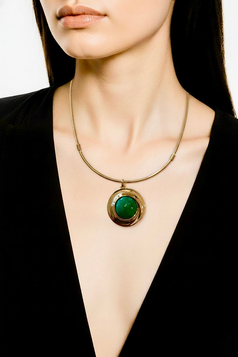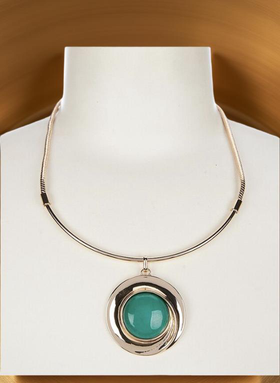 Alone, this is a stunning gold-tone necklace that features a prominent green stone with a swirl design pendant. Imagine layering it with a simple chain necklace!! The centerpiece of this necklace is suspended from a sleek, rigid gold-tone torque-style necklace that sits elegantly on the neckline.