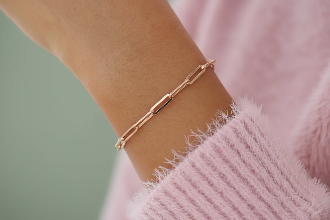 This contemporary paperclip bracelet features oblong oval links that offer a modern yet timeless appeal. This dainty and versatile piece can be worn alone or layered with other bracelets for personalized style.